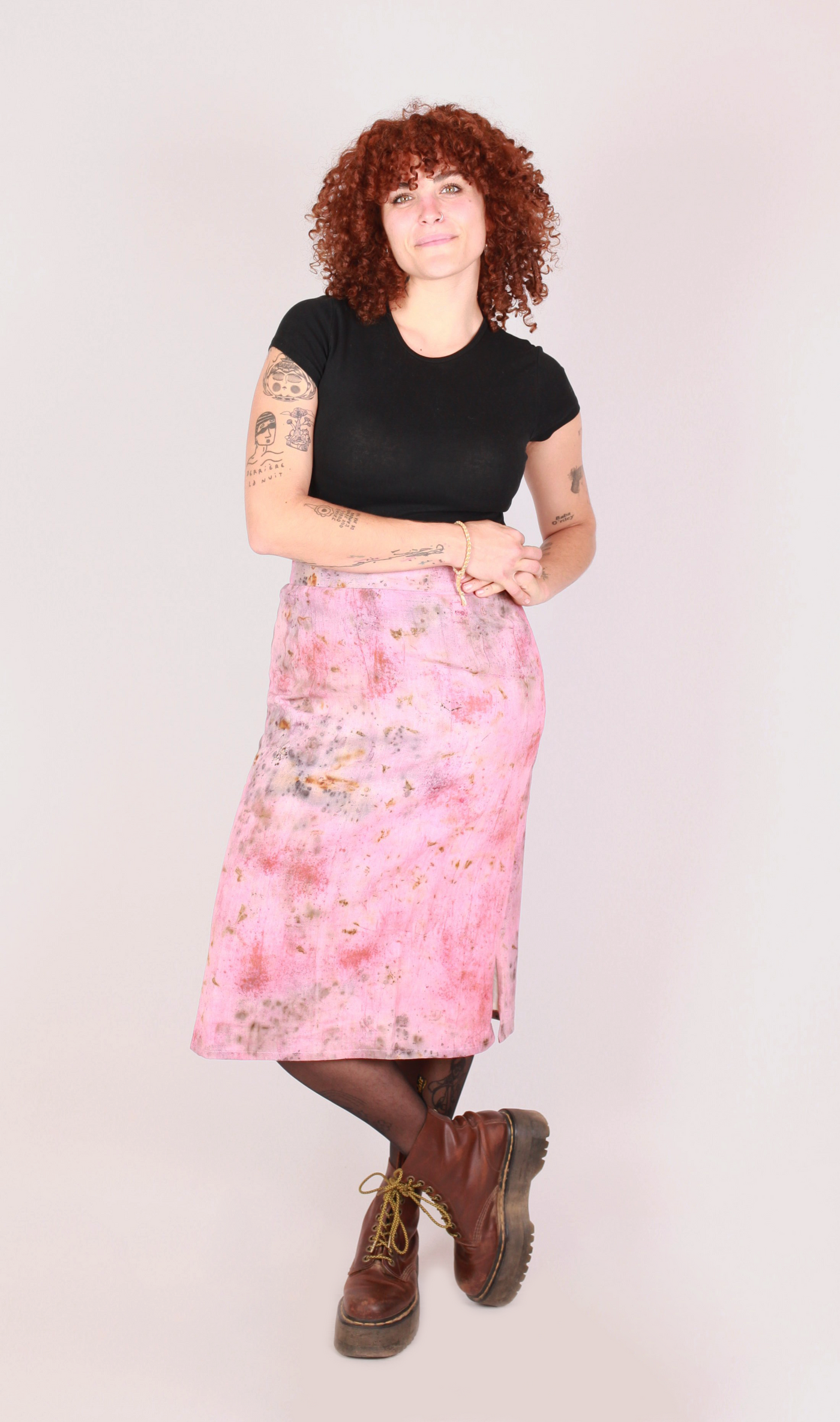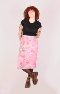 ZINDAGEE est un imprimé spontané, créé à partir d'emprunte végétale de poudre de garance pour la base rose, de pétales de fleurs de souci, de pétales de roses rouge, de fleurs d'hibiscus, de graines de cumin, de graines d'annatto, de feuilles d'amandier et de rouille de fer.