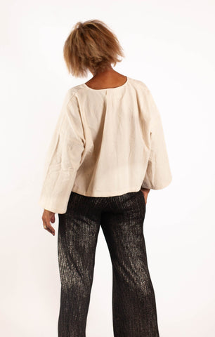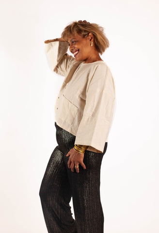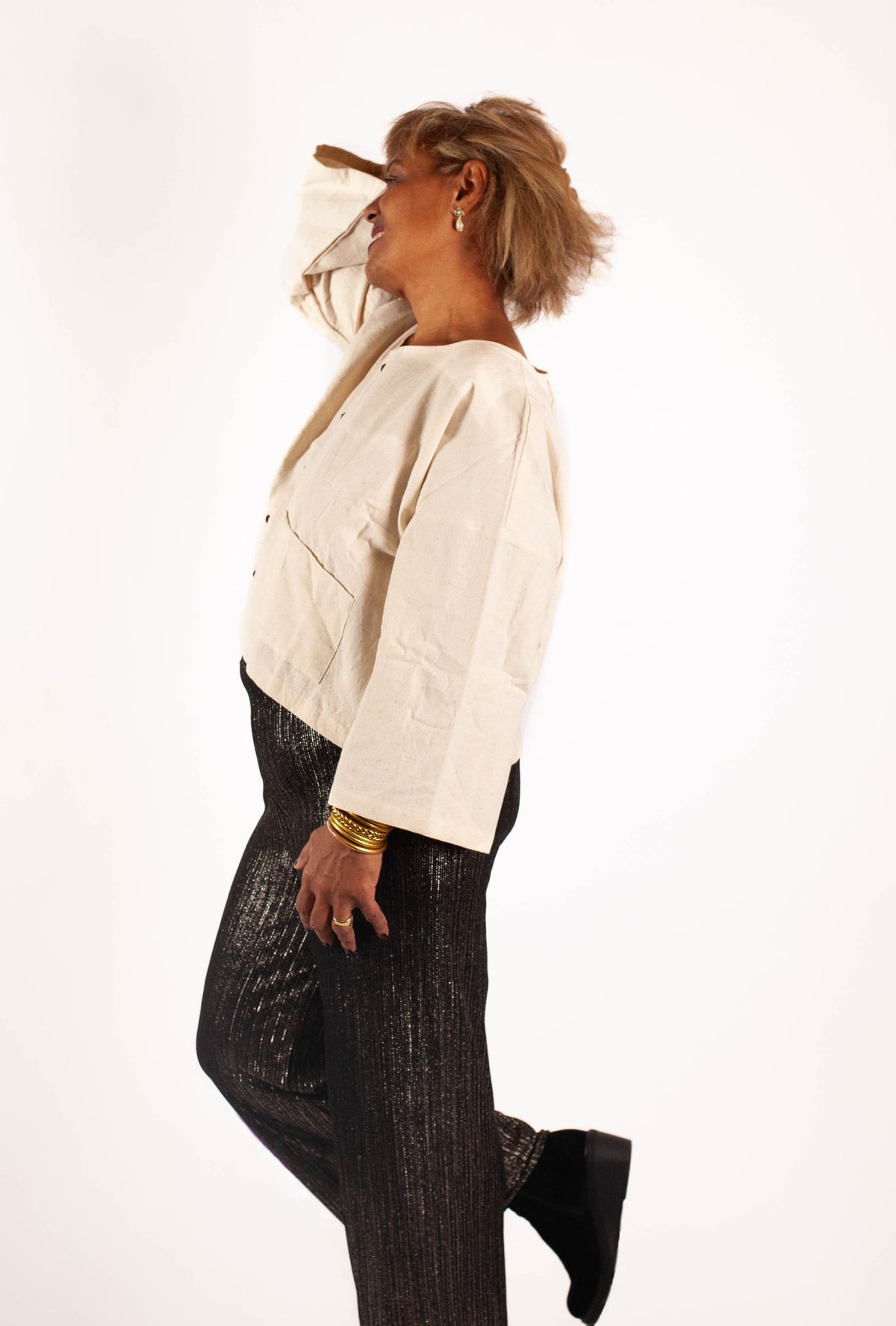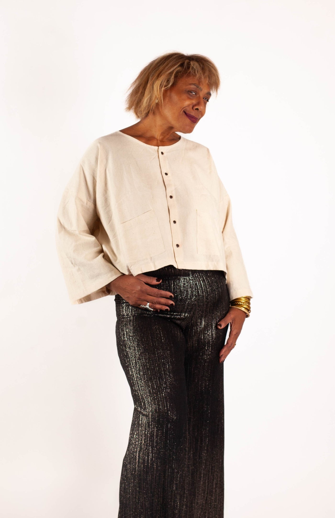 Un coupe carrée et courte qui nous rappel a la fois la forme d'un kimono croisé avec un boléro... Complètement renversant, versatile et le tout, toujours produit de manière éthique !
